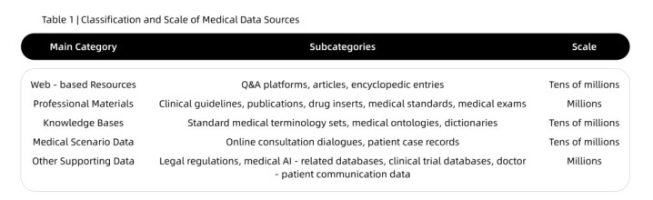 医学知识:对于非结构化知识数据,团队基于特定方法的数据选择流程,将其用于持续预训练、指令微调、监督微调和强化学习等阶段。对于大语言模型(LLM)无法直接使用的结构化数据,团队使用知识转换技术将其转换为自然语言数据。