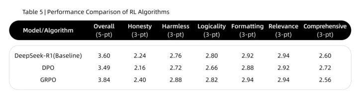 同时,团队对直接偏好优化(DPO)和群体相对策略优化(GRPO)进行了比较分析,用于评估它们的有效性。实验结果表明,GRPO在大多数维度上的表现显著优于 DPO。GRPO模型在总体得分、诚实和无害等关键维度上取得了最佳表现。因此,团队选择GRPO作为本项目的核心RL算法。
