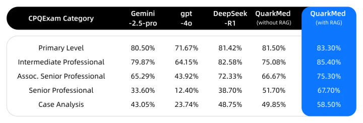 内部基准测试表现:中国医师资格考试(CPQExam)分为初级、中级、副高级、高级四个级别。在与通用模型对比中,夸克健康大模型呈现出考试难度越高、领先优势越明显的性能曲线。