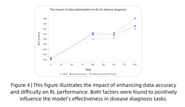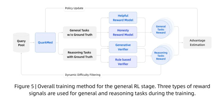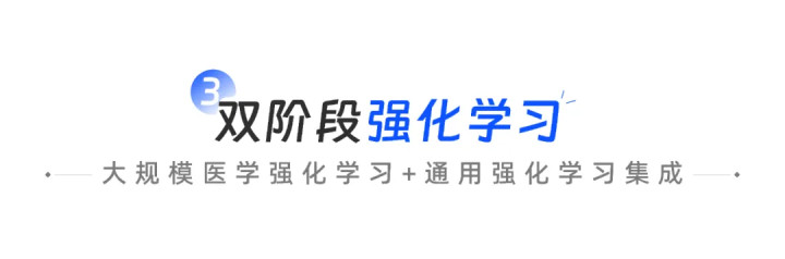 在医学领域方面,尤其是疾病诊断、合理用药和检验开具等核心任务,本质上均属于知识密集型,且高度依赖复杂的推理。为了显著提升大模型在这些复杂场景中的推理能力,团队进行了一个专门针对推理任务的强化学习(RL)阶段。